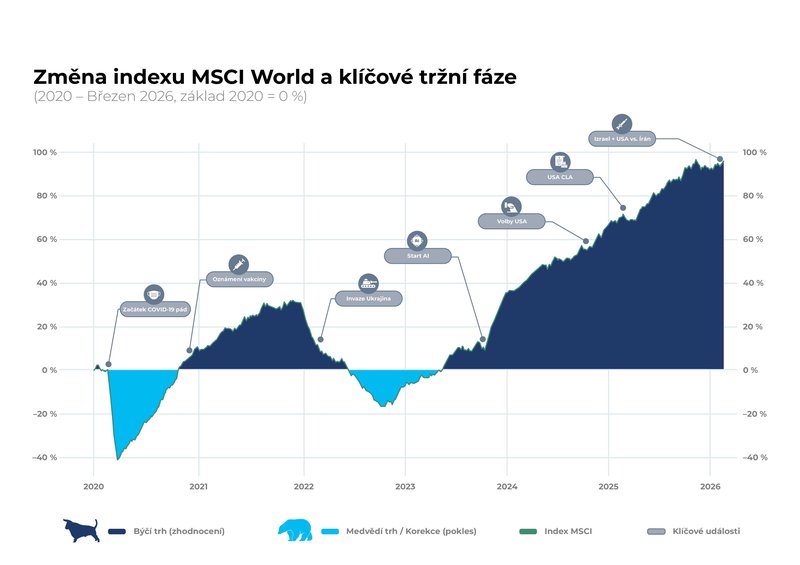 Navzdory všem těmto globálním šokům vzrostl index MSCI World od začátku roku 2020 do března 2026 zhruba o 85 %. Právě uplynulé roky znovu ukázaly, že globální akciové trhy mají mimořádnou schopnost přizpůsobit se i velmi silným otřesům a navzdory nim si dlouhodobě zachovat růstovou tendenci.